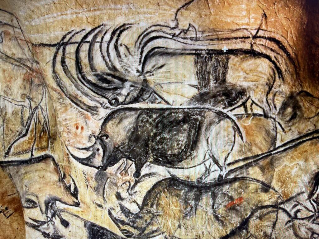The piece I chose is called “Rhinoceros panel” and its location is on one of the walls of the Grotte Chauvet cave in southeast France. It has been dated to about 30,000 BCE so it was done in what we consider the Paleolithic Era. It depicts a herd of wooly rhinoceroses facing left against a lone rhinoceros facing right. Wooly rhinoceroses are a now extinct animal but were a common appearance at the time appearing in numerous other prehistoric paintings. It’s an interesting visual with the perspective of the drawing causing the viewer to feel slightly above the scene, perhaps on a cliff. Charcoal and engraving were the primary tools used for this piece. In class we discussed how the only way ancient people could see their paintings was by firelight and I can easily imagine how these rhinoceroses would look illuminated by the flames.